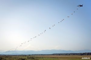 L’A400M d’Airbus a franchi une nouvelle étape avec le largage simultanée de 80 parachutistes.