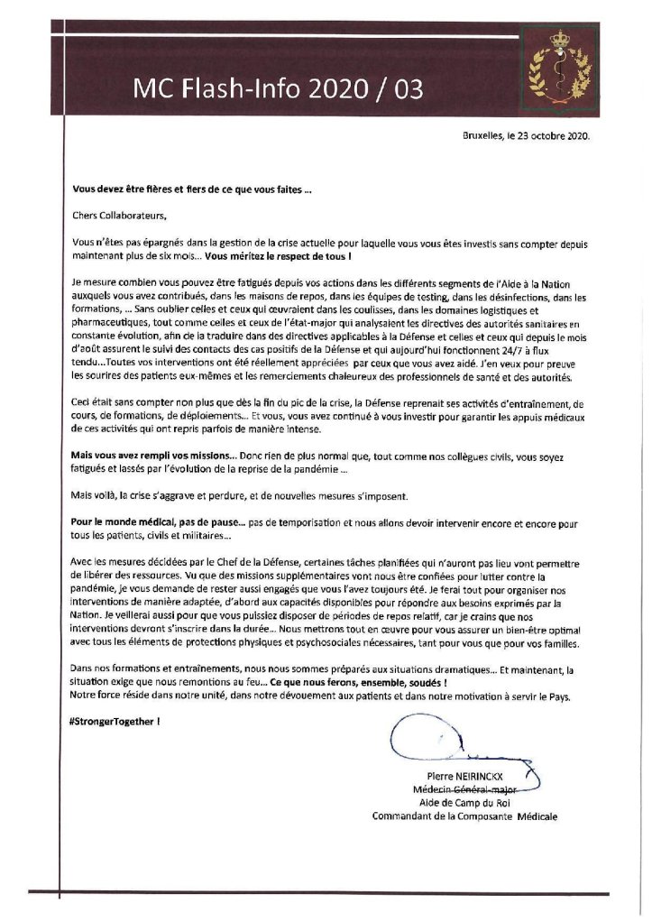 Par ailleurs, le chef de la Défense, l’amiral Michel Hofman, a pris des mesures pour son personnel. Les entraînements seront au maximum suspendus jusqu’au 20 novembre. Les 1.200 militaires de la Brigade Motorisée ont pu terminer leur période d’entraînement en Allemagne malgré plusieurs cas de contaminations. Seules sont prioritaires: la préparation aux déploiements et la formation surtout celle de base. Le télétravail est de nouveau la règle et les unités devront travailler avec un effectif réduit. Les activités protocolaires sont suspendues. « Cependant, il est tout à fait possible que des mesures nationales encore plus strictes soient prises avant cette date, mesures qui nous obligeraient, par exemple, à suspendre temporairement certaines parties de la formation également (par exemple : la formation spécialisée) », prévient le chef de la Défense. Ces nouvelles mesures permettront aussi de libérer du personnel pour exécuter les tâches d’appui dans le cadre la lutte contre la Covid-19.