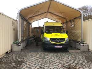 Le 31 octobre, la 3ème compagnie CBRN du 4ème bataillon de Génie d’Amay avec l’aide de la 15ème compagnie Construction et du Field Accomodation Unit a installé une ligne de désinfection pour les ambulances bruxelloises sur l’esplanade du Cinquantenaire. Cette ligne est active depuis dimanche. Ainsi le SIAMU bruxellois pourra compter sur une troisième unité pour désinfecter ses ambulances Covid-19. Selon Walter Derieuw, porte-parole des pompiers de Bruxelles cité par la RTBF, cette unité devrait réduire l’indisponibilité des ambulances après le transport de malades Covid (ou suspectés de l’être). Après chaque transfert de patient, l’intérieur et l’extérieur de chaque véhicule doivent être désinfectés, ce qui peut rendre le véhicule indisponible pendant une heure trente.