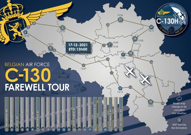 Pour ses adieux au C-130, la Composante Air organise un vol spécial au-dessus de la Belgique le 17 décembre. Il saluera un certain nombre de sites belges tels que l’Atomium, la Côte et il rendra également un dernier hommage aux unités de la Composante Air ainsi qu’à certains aérodromes civils et militaires. Le vol débutera à 13H et se terminera à 15H45. Il est conditionné à la météo.