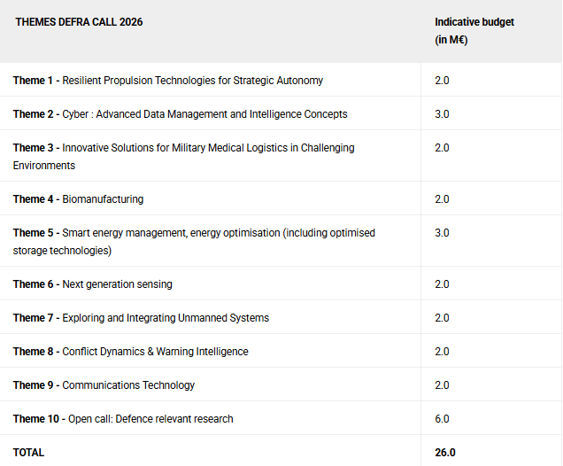 Ce programme implique un montant de 625.106.000 euros en crédits d’engagement, alloués à des travaux de recherche scientifique et technologique de la Défense et à l’opérationnalisation de la Stratégie de Défense, d’Industrie et de Recherche belge (DIRS). Le budget pour la DIRS se monte à 3% du budget de la Défense, « augmenté des montants annuels complémentaires repris à l’annexe IV de la loi du 12 décembre 2025 » (35 millions d’euros en 2026).